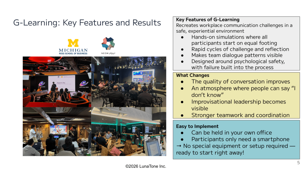 Playable WORKFORCE Any level of employees Any Organization, Any Size 2 hours ~ 1 Day In-Person / Online / Hybrid ¥50,000~ / Person [G-Learning] A Game-based Team Communication / Leadership Corporate Training Program A Game-based Team Communication Corporate Training Program